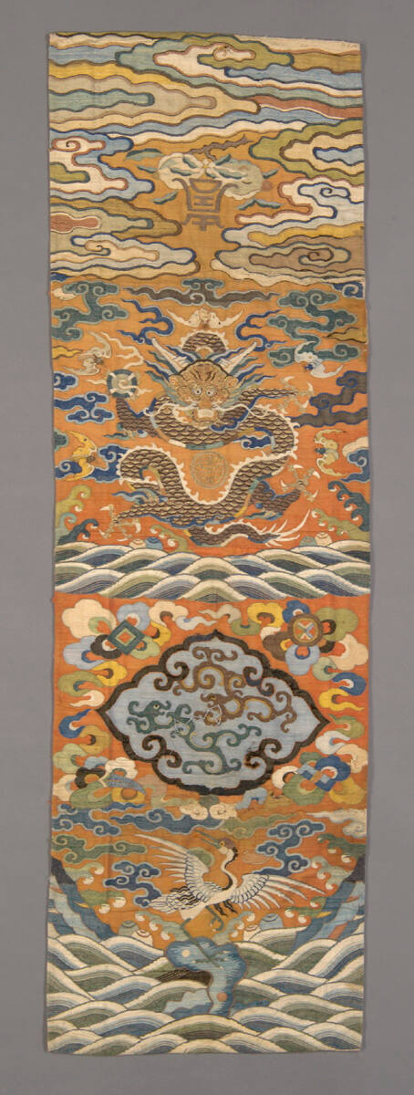 DescriptionChair cover decorated with dragons, waves, clouds, phoenixes and flowers in blues, greens and golds. Lined with salmon silk brocade.