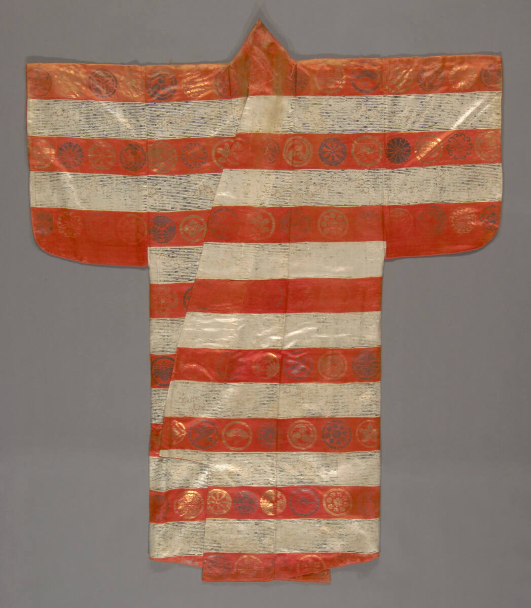 DescriptionWhite silk ground with tie dyeing and gold- and silver-leaf stencil designs. Surihaku type No robe with repeating horizontal bands of waves and mon (crests).