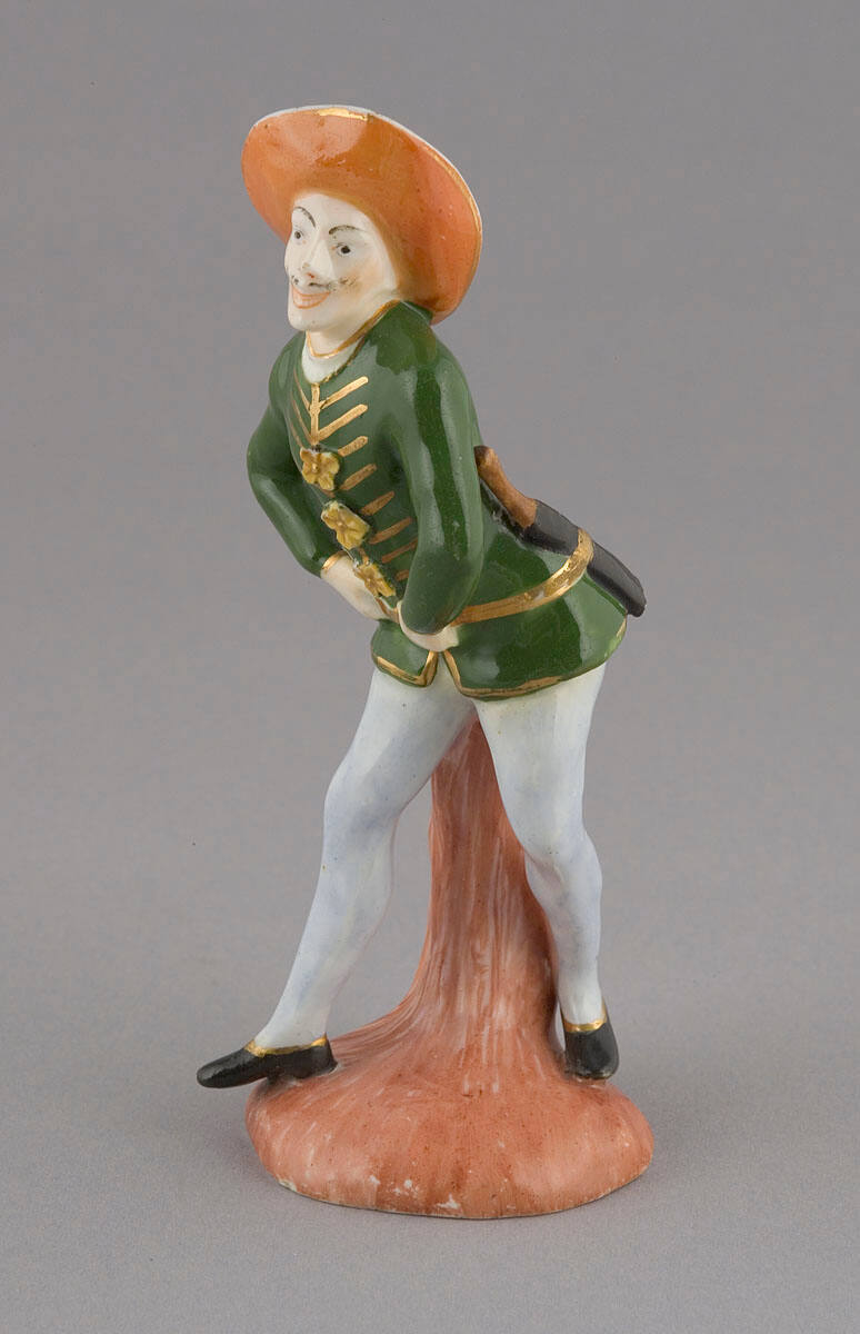 DescriptionMale figure; standing supported by pink tree trunk, leans slightly forward from waist where both hands clasp belt, left leg behind right; wears white hat with wide, upturned orange brim; green jacket decorated with gold rosettes, long grey hose and black shoes; mustache.