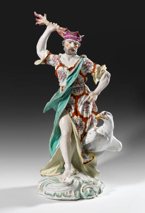 DescriptionStanding male, gray-haired, wearing lavender crown, light blue cloak over tunic in orange with white reserves bearing floral sprays; yellow lining of tunic visible where turned back at elbows; holds rose and yellow thunderbolt in upraised right hand; left hand on hip above eagle with yellow bill, puce brows, gold body markings. Both figures stand on shaped, scrolled bases marked in green and gold.Exhibition HistoryLuxury and Passion: Inventing French Porcelain, The Nelson-Atkins Museum of Art, Kansas City, Missouri, August 13 2022–August 12 2024, no cat.