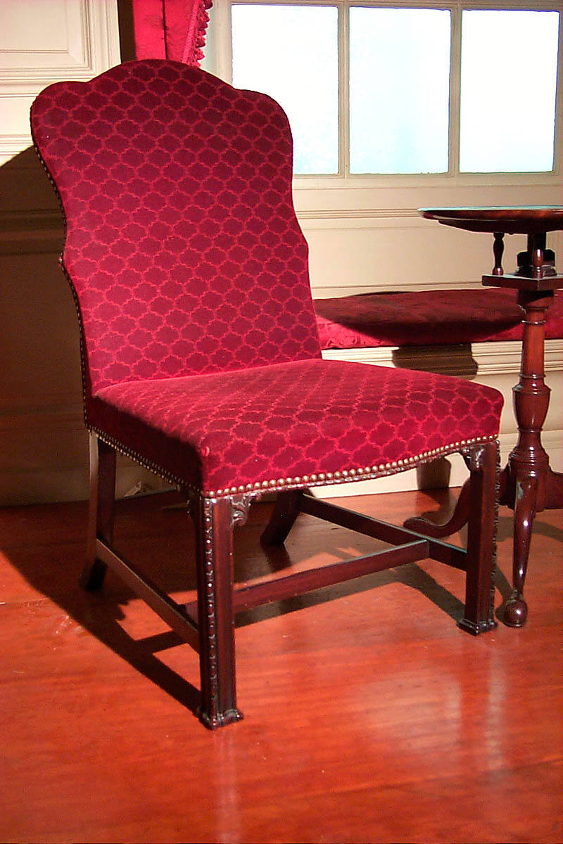 DescriptionThe back of this upholstered back stool has a rounded crest rail and undulating sides. The seat is supported on straight front legs and canted rear legs. Plain, rectangular stretchers join the legs. The front legs have egg-and-dart molding run around the bottom edges of the seat rails. The seat rails are tenoned into the legs. The joints at the front corners are reinforced with replaced, shaped glue blocks. The joints at the rear are reinforced with straight cross braces.Published ReferencesRoss E. Taggart, "The Impact of China on English and American Furniture Design," Journal of the Classical Chinese Furniture Society 2, no. 3 (Summer 1992): 56-65. ill. p. 64, fig. 17