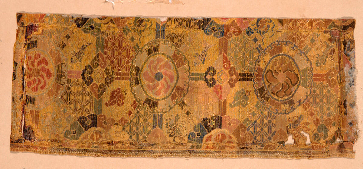 DescriptionDark blue stain brocaded in gold thread, now tarnished, in design of dragons running through clouds.