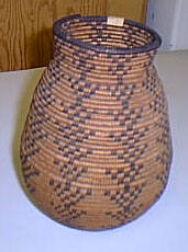 DescriptionCoiled construction. checkered triangles in vertical lines from rim to bottom. are black.