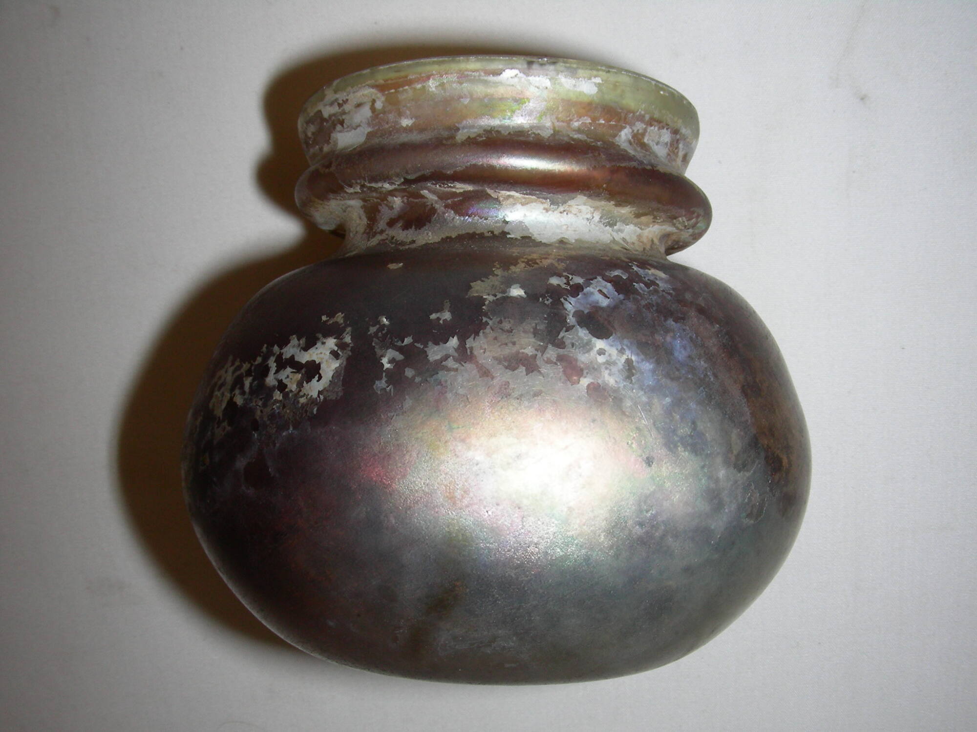 [1] The Nelson-Atkins and the Pacific School of Religion co-sponsored an archaeological expedition at Tell en-Nasbeh, northwest of Jerusalem, in 1932. The expedition was led by Dr. William Frederic Badé. The partage agreement between the institutions specified that if the artistic quality of the found objects was not satisfactory to the Nelson-Atkins, the Pacific School of Religion would transfer objects from its own collection to the Nelson-Atkins to supplement the more recent finds. This object is one of four purple glass pieces transferred from the Pacific School of Religion to the Nelson-Atkins as a result of this agreement. William Frederic Badè wrote in a letter to J. C. Nichols, Nelson-Atkins Trustee, July 1, 1933, NAMA Registration Files: “To this I have added four pieces of purple glass, quite rare, which I secured in a very fortunate manner from a tomb of the 1st or 2nd cent. A.D. at Jebna (Arabic, Yebna)….This purple glass is also one of our previous acquisitions.”