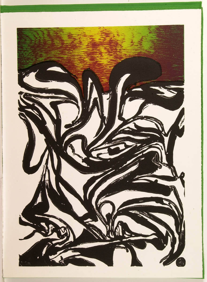 DescriptionPhoto-engraving with woodcut section in reddish-brown striations over chartreuse and green ground; sweeping black design of large bent draped figure moving left, smaller figure atop its back at upper right.Copyright© Norman J. Wagner