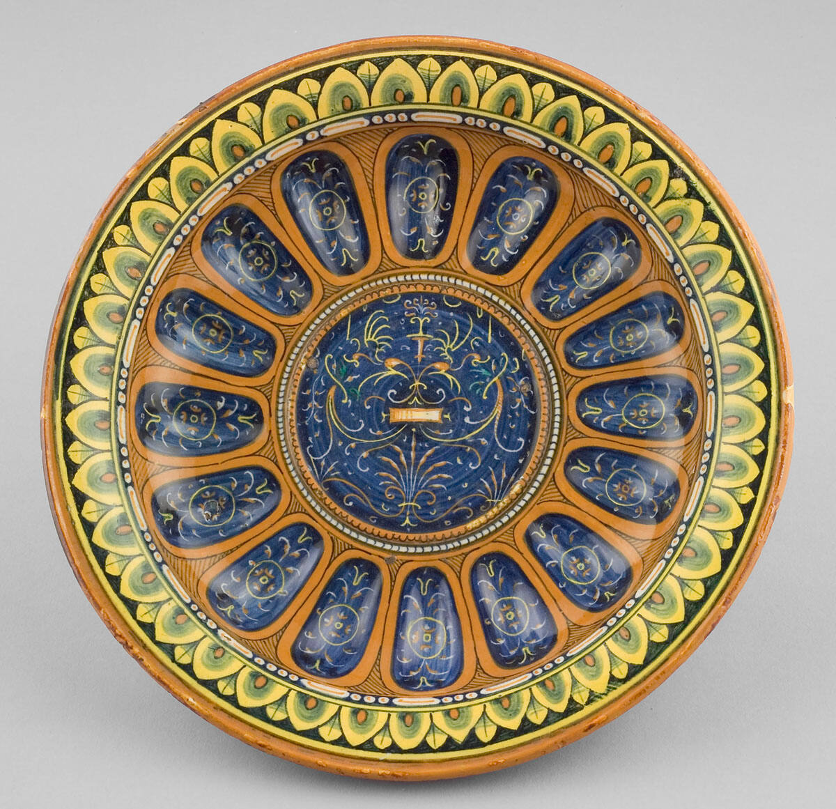 DescriptionFaenza fruit dish with blue, orange and green ground with arabesque decorations.Exhibition History
