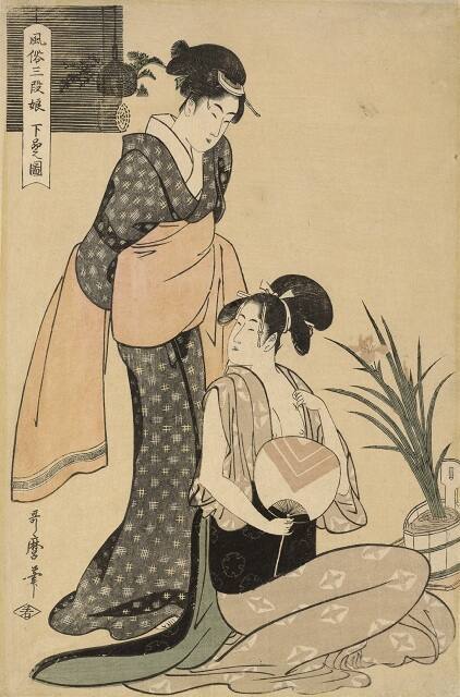 An important artist of Ukyio-e, Kitagawa Utamaro was celebrated for his images of beautiful women, both geisha (courtesan) and ordinary women. His favorites are these sensual, slender beauties engaging in everyday activities.
