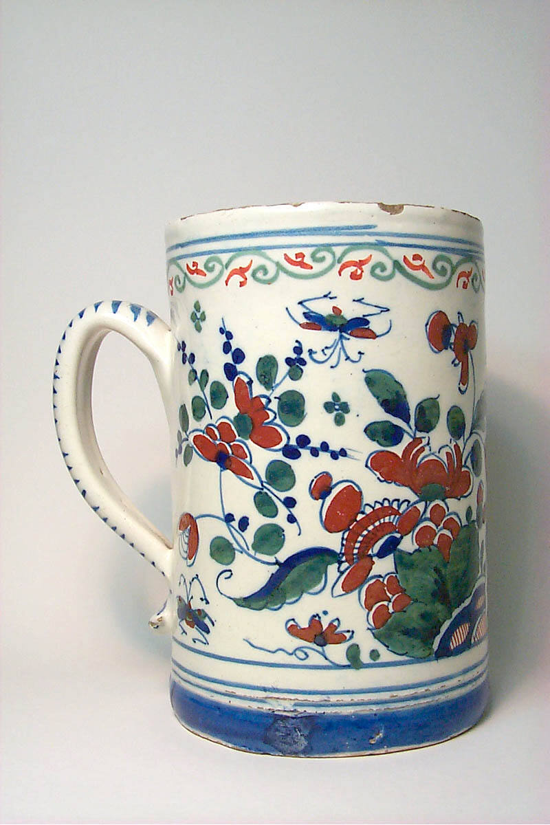 DescriptionCylindrical form decorated on sides in polychrome with foliage, insects and a bird standing on a rock. Flat looped handle painted with horizontal blue stripes.