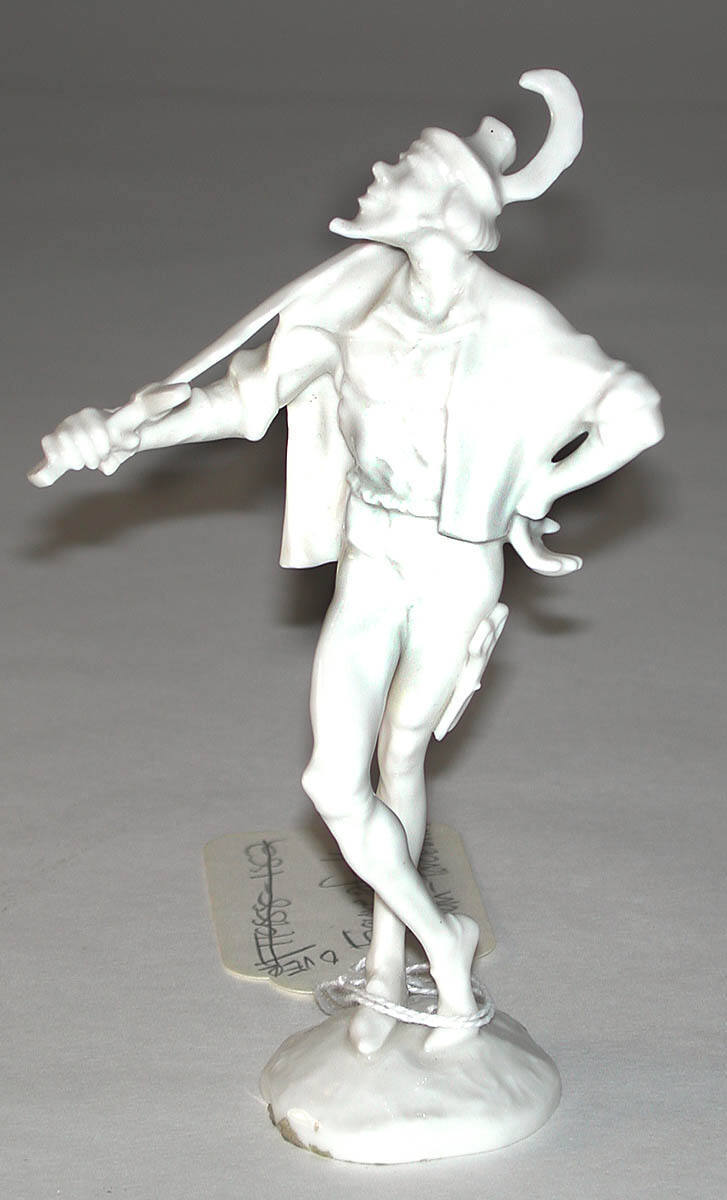 DescriptionFigure with long nose and pointed beard stands cross-legged on a circular mound base. Their head turned to right with left hand at hip, right hand outstretched holding a sword over right shoulder. The figure wears a hat with a long feather, tight fitting costume with short cloak, and has scissors below hand at left side. On bottom: impressed K-Tutter.