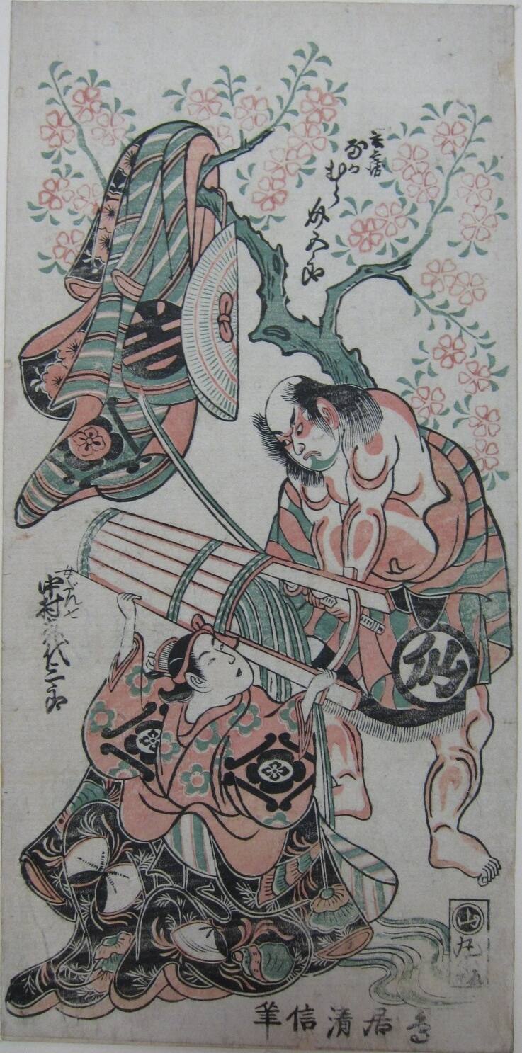Torii Kiyonobu II captured a dramatic moment on a Kabuki stage that would have excited spectators as the story unfolded. Onna Danshichi, on the ground, defends herself with a water bucket as her enemy Shōbei swings a sword down on her. Kiyonobu II amplifies vicious Shōbei’s physical power with exaggerated muscles. This was a hallmark of the Torii school, a lineage of artists who specialized in designing popular actor portraits.