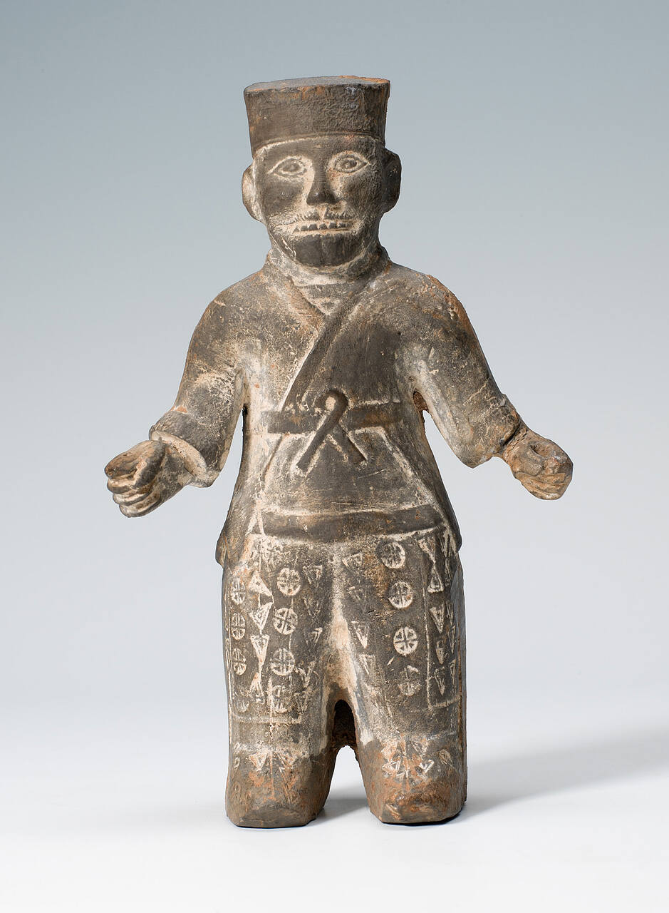 DescriptionStanding male figure made from black clay, with pressed designs of robes and pattern pressed into the trousers.