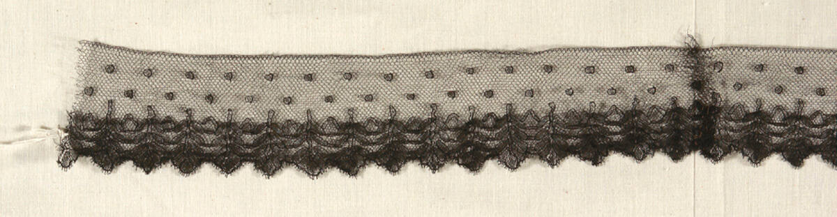 DescriptionBobbin-made straight lace of the Chantilly type. Twist net ground and a pattern in half-stitch with a thicker outlining thread. Vandyked lower edge trimmed by the points of simple floral sprigs. Two rows of point d'esprits decorate the net ground.Provenance