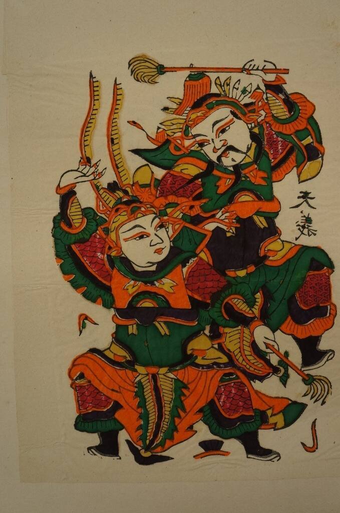 Gallery LabelThis print of an opera story is one of a pair to be pasted on door panels or hardwood furniture. The play tells of two combating warriors who realize they are long-lost brothers when they pull out identical gold spears, thus ending the play with a happy reunion. The theatrical costumes are meaningful for their military insignia: on the lower figure’s headgear, the two long projections are pheasant feathers worn by an actor on stage to represent the warrior’s bravery.