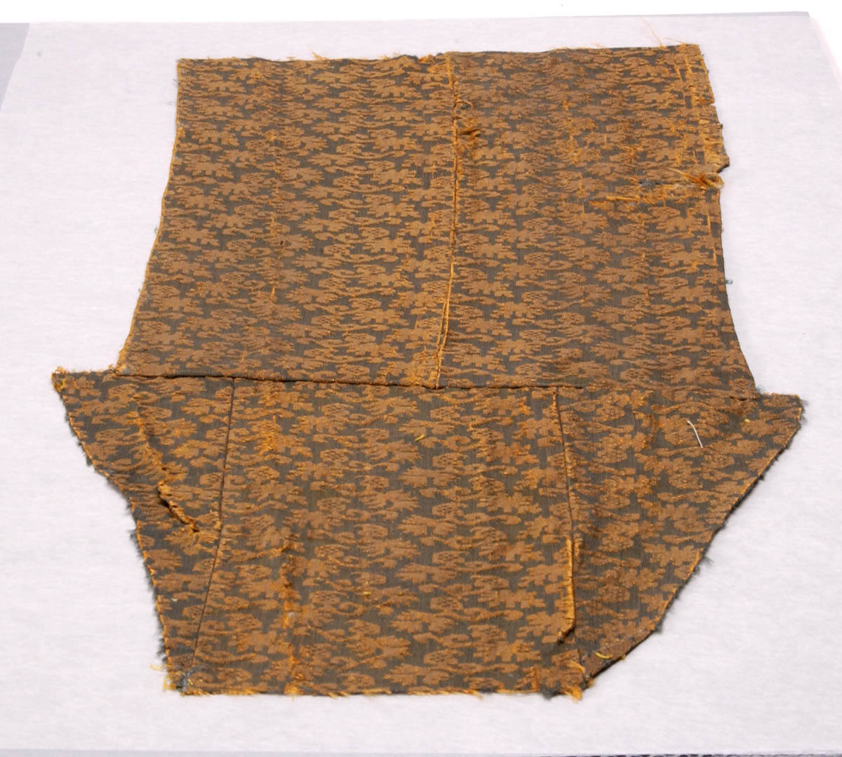 DescriptionBlue background, all over conventionalized leaf design in tan.