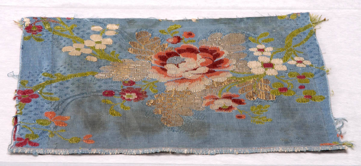DescriptionConventionalized flowers of red and white, green stems, and leaves of silver thread on a blue background.