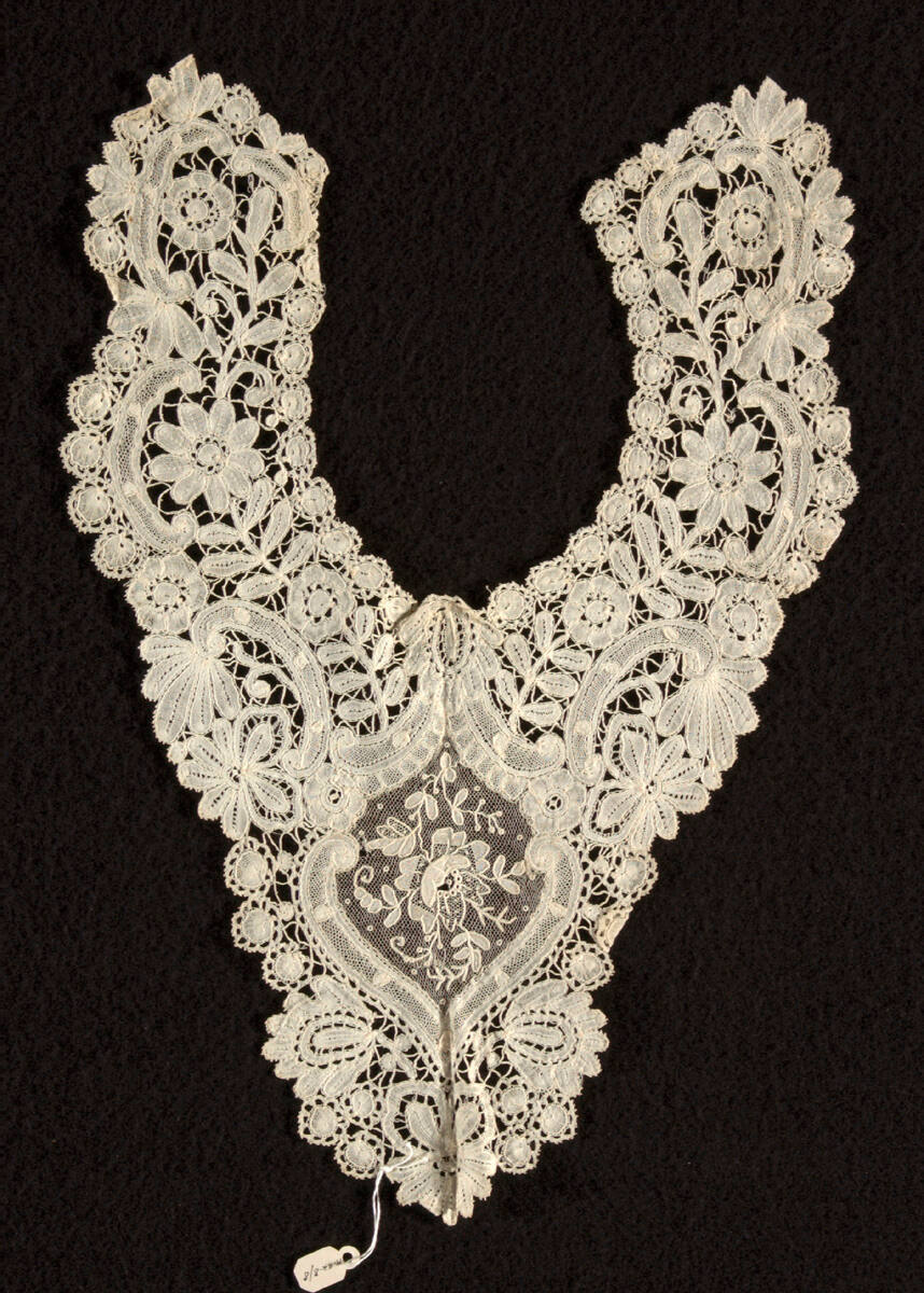 DescriptionMixed needle and bobbin lace of the type known as Duchesse de Bruxelles. Largely made of fairly coarse bobbin lace (part lace), with a central medallion filled with point de gaze needle lace, with an applied, three-dimensional petal.