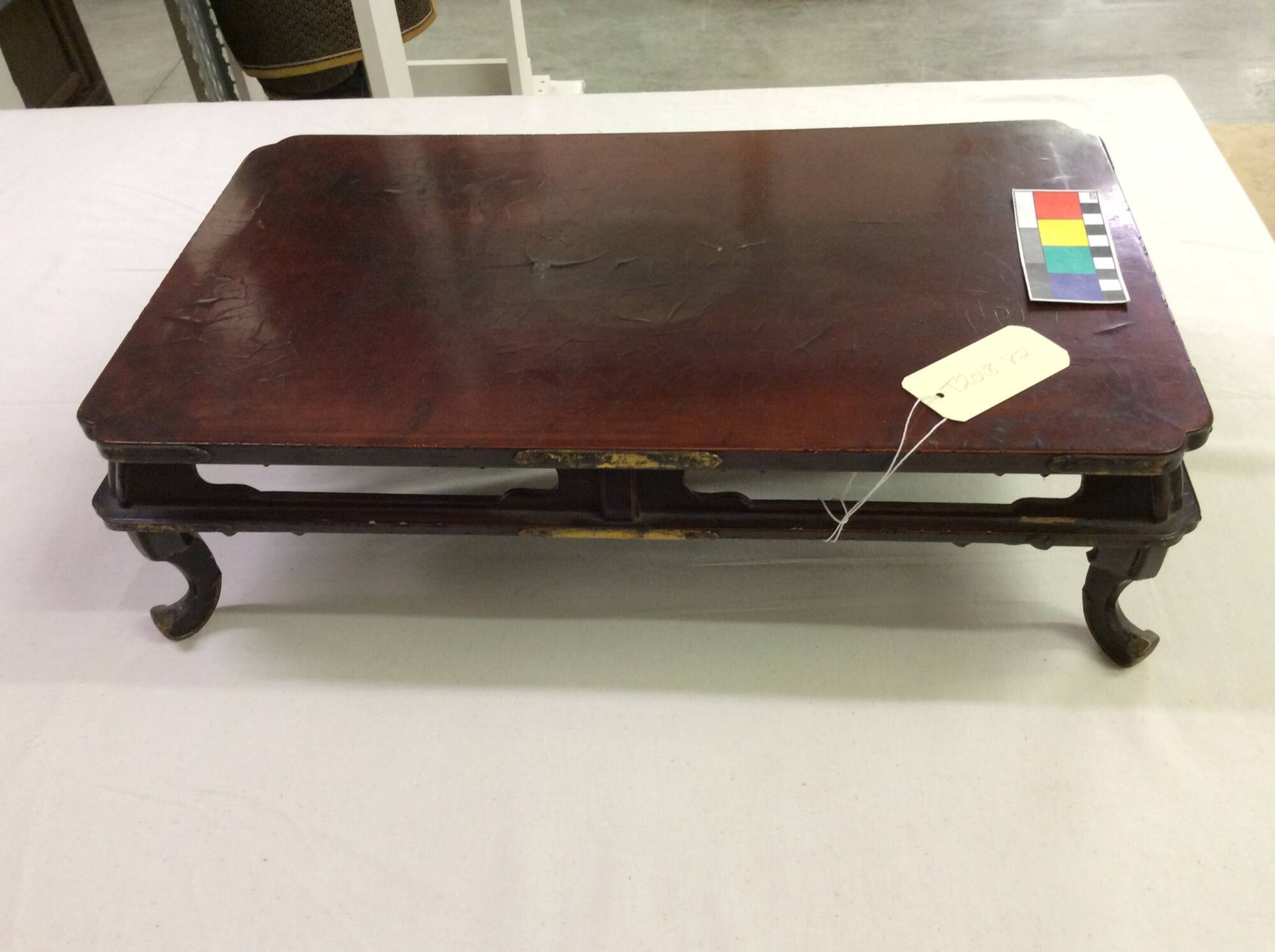 DescriptionDark brown lacquer. Narrow apron with openwork scalloped design and bronze fittings. Low legs, upcurved feet.