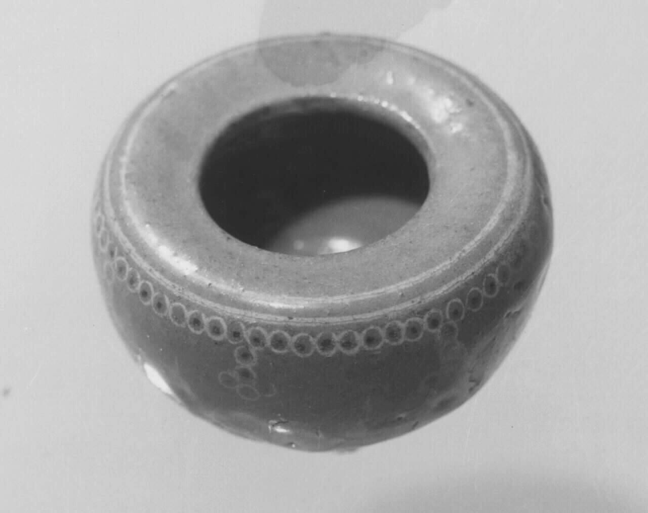 DescriptionBowl with inverted lip with decoration of stylized water birds in lotus pond. Light gray stoneware with decoration inlaid with black and white slip under celadon glaze.