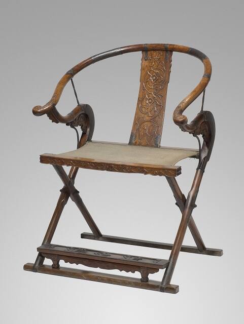 DescriptionA huanghuali folding horseshoe armchair with three-part arm supported on an S-curved circular section post which becomes square in section where the rear rail of the seat frame is tenoned into it before becoming circular again to form the front t legs. At the point at which the legs pivot the inside edge has a square shoulder. The C-curved splat in tenoned into the underside of the arm and the back rail of the seat frame and is carved with a continuous floral scroll with three mountain peaks to the base. The front seat rail, into which the rear legs are tenoned has a cusped outline carved with a central flower head and scrolling tendrils. Slab feet join the legs at the base, the front foot carved with an incised floral scroll, the footrest is square tenoned into the inside edge of the legs with a shaped apron with incised floral scroll and two animal headed shaped legs. Each pressure-pin scarf joint and tenon is reinforced with damascened iron mounts, and there are two straight damascened iron supports between the arm and the S-curved posts and C-curved supports within the crook of the support. The footrail is also mounted with damascened iron with a design of two interlocked rhinoceros horns and a central coin. Second half of 16th century.Gallery LabelElaborate folding chairs were often used by officials, since they were easy to transport as they traveled between their postings in the provinces. The proportions, carving, and ironwork make this one of the finest folding chairs known. If you look closely at the iron mounts, you will see that they are inlaid with silver.