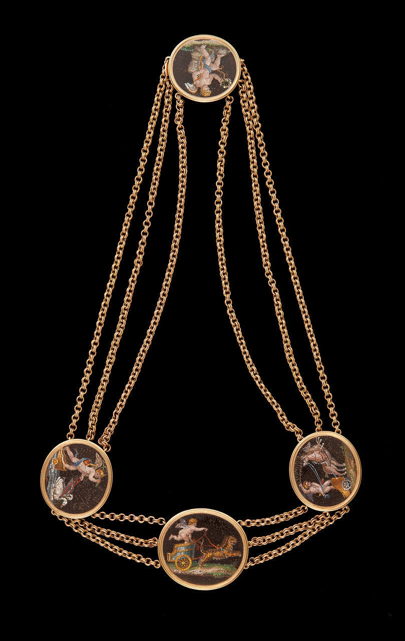 DescriptionGold necklace with three oval and one circular mosaic. Designs of putti of different occupations.Exhibition HistoryOrigins: Collecting to Create the Nelson-Atkins, The Nelson-Atkins Museum of Art, Kansas City, MO, August 14, 2021-March 6, 2022.