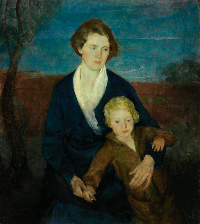Gallery LabelOne of a number of secular paintings by Charles Hawthorne that resemble a Madonna and Child, Mother and Child was created at a moment when anxiety about falling birthrates was running high. This canvas is also a somber meditation on the United States' entry into World War I. Here, the dark palette, the mother's distracted expression and the child's scaled-down, olive drab uniform all serve as reminders of American soldiers' absence from home.