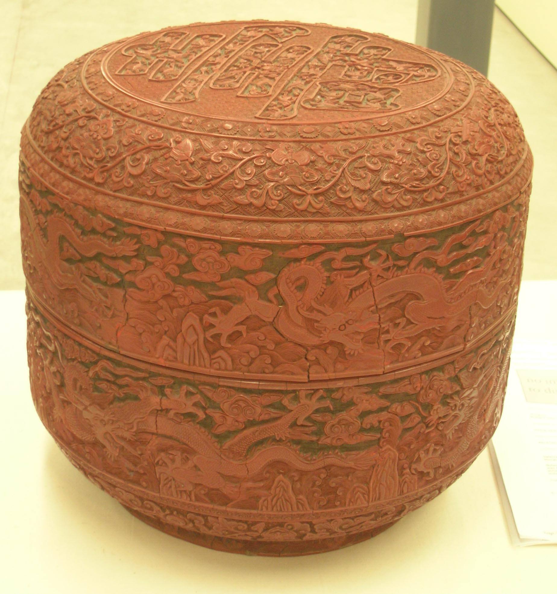 DescriptionCircular, red lacquer box elaborately carved with dragons and flowers.