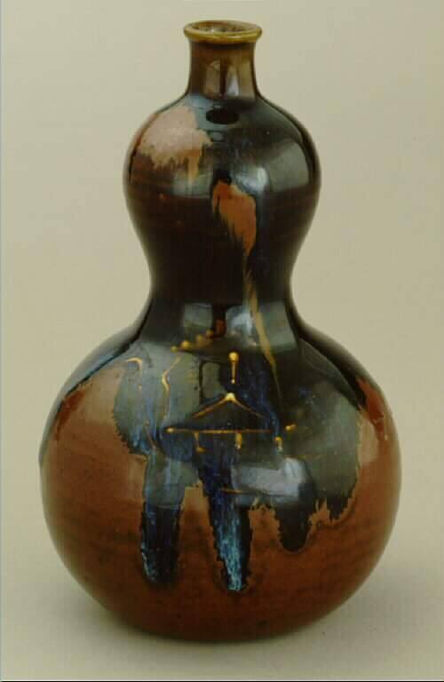 Gourd-shaped sake bottle with slip-trailed design of a hut in the mountains
