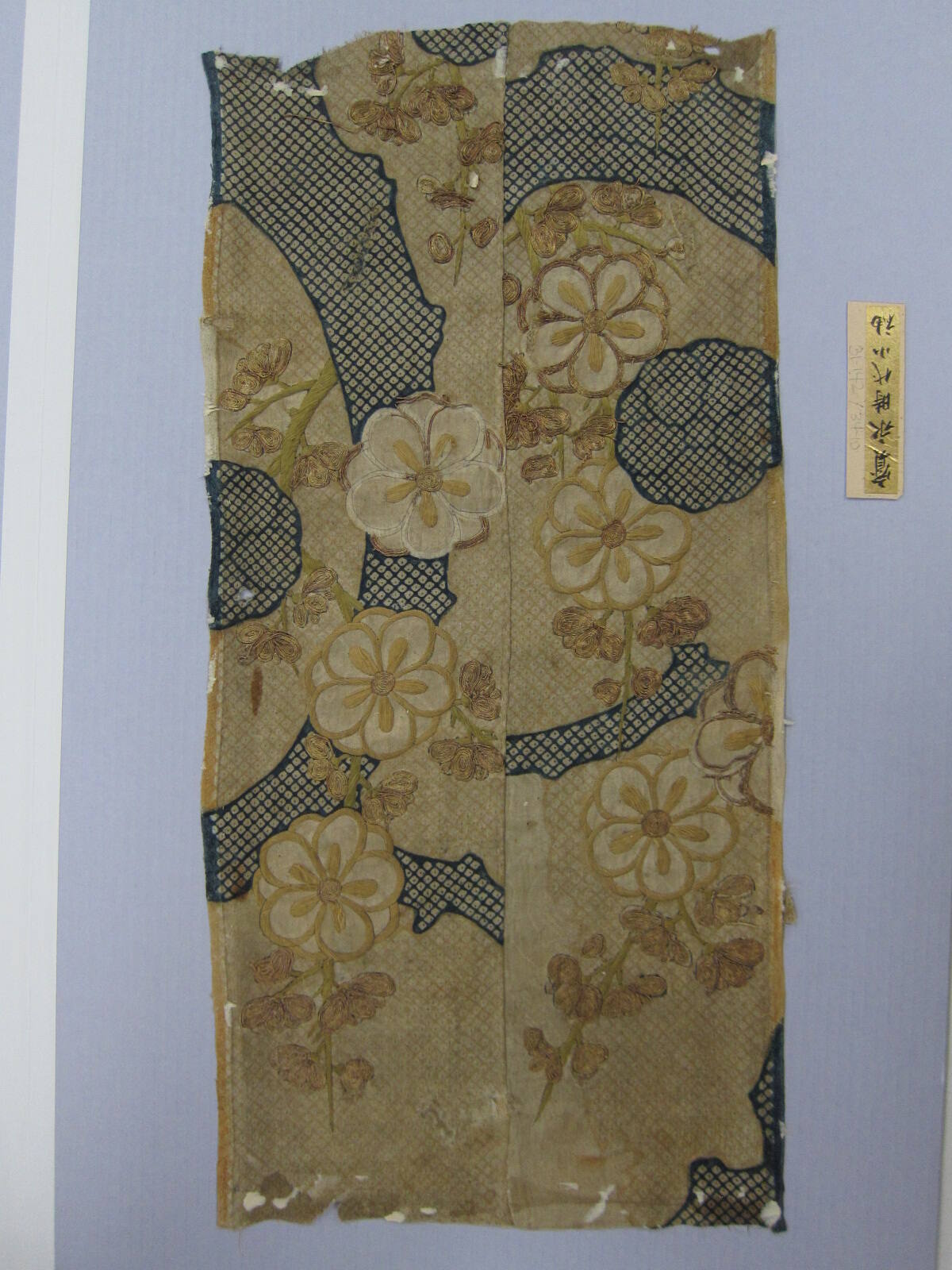 DescriptionGold figured satin ground with stencil tie dyeing, silk and metallic thread embroidery. Design of a branch of a plum tree.