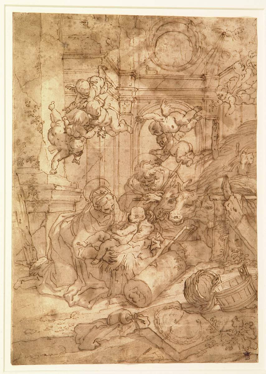 The story of Christ’s first night on Earth is among the most popular subjects in Christian art. This preparatory study for an etching depicts the sacred event in the ruins of a once-splendid palace. The decaying structure, with its cracked walls and toppled columns, symbolizes the end of the old order of the world. Its deteriorated condition underscores the youth of the newborn child and his promise of redemption.