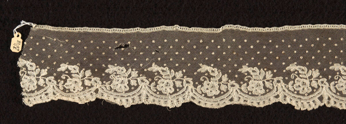 DescriptionBrussels application lace; bobbin-made part lace on machine-made net. Average quality, worked mainly in whole stitch. Shallow scalloped lower edge, with a floral sprig within each scallop. The remaining ground decorated with point d'esprits.Provenance