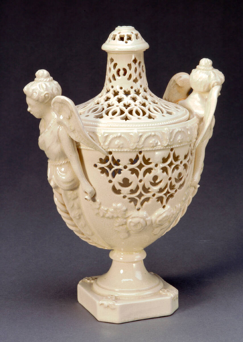 DescriptionSlender ovoid footed urns with two handles in the form of winged female termes, the side pierced with formalized blossoms. Steeple domed covers, with leaf finial. Probably Leeds.