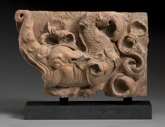 This mythical composite animal, a symbol of water and fertility, has an elephant’s head and trunk, a fish’s body with the tail ending in exuberant curls, and two feet with feline claws.