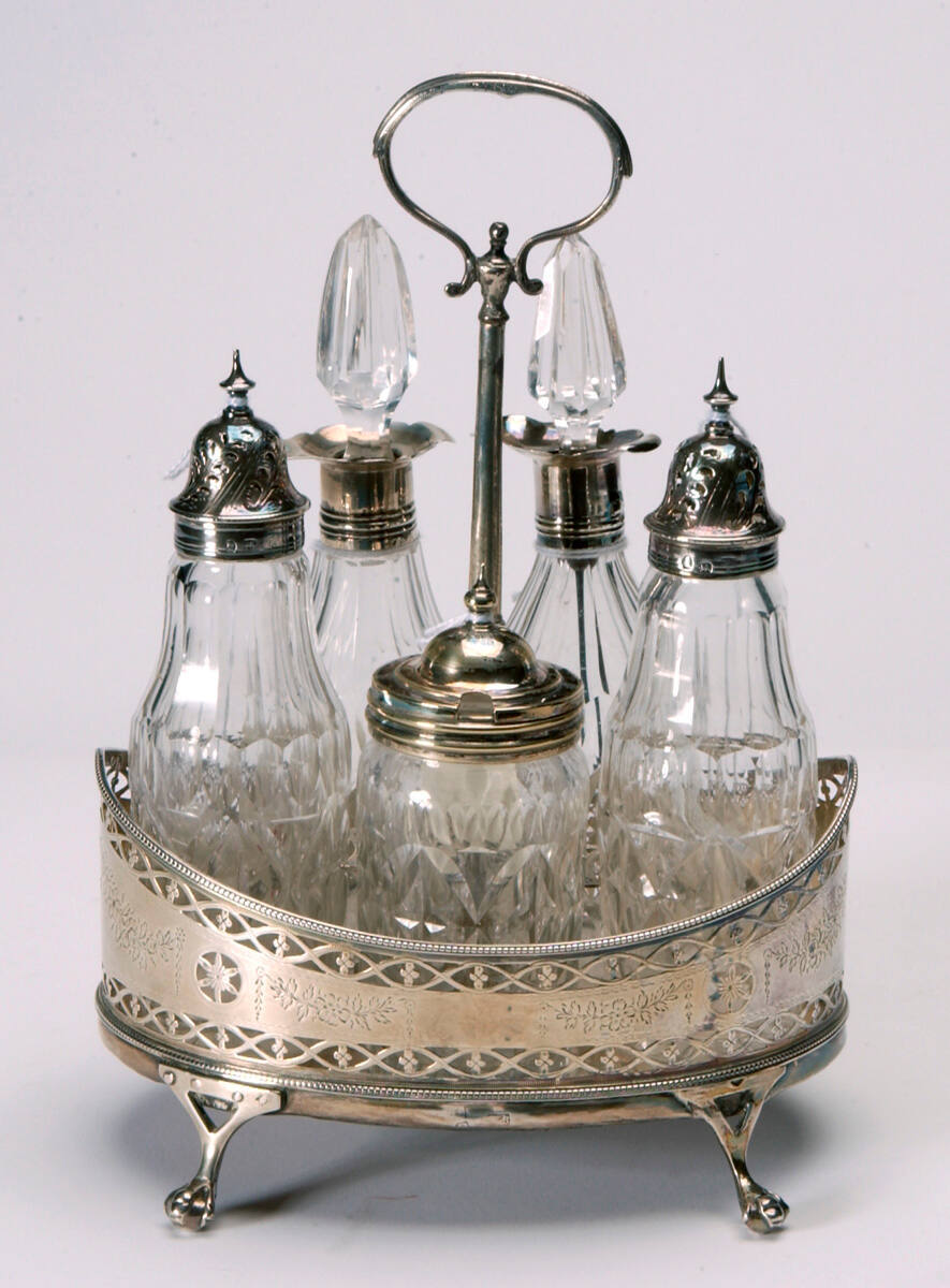 Cruet Stand with Salt, Pepper, Mustard Jar, and 2 Cruets