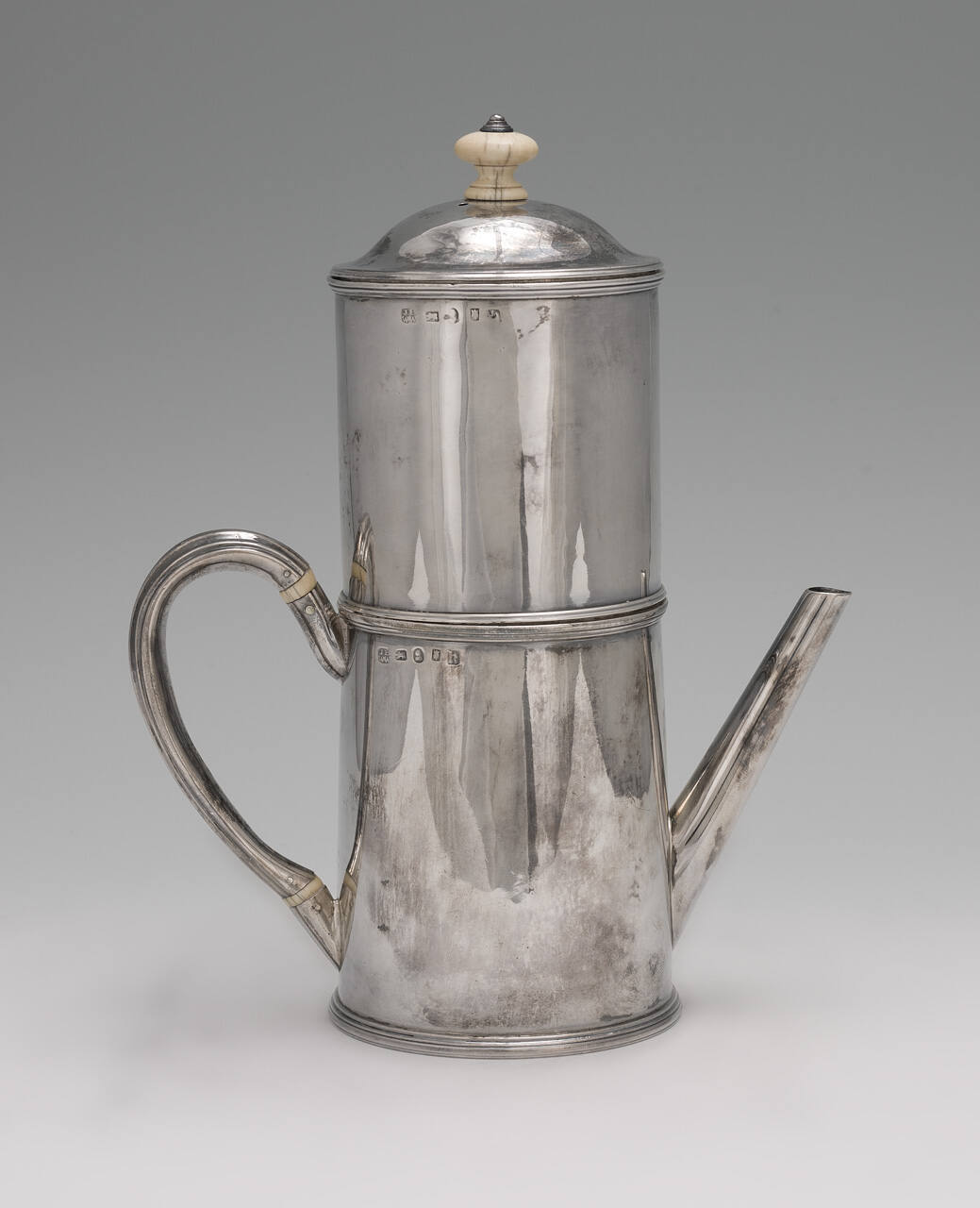 DescriptionPlain cylindrical silver coffee percolator with a straight tapered spout. Narrow bands at rim, waist, base, and handle; the low domed cover is surmounted with an ivory finial.