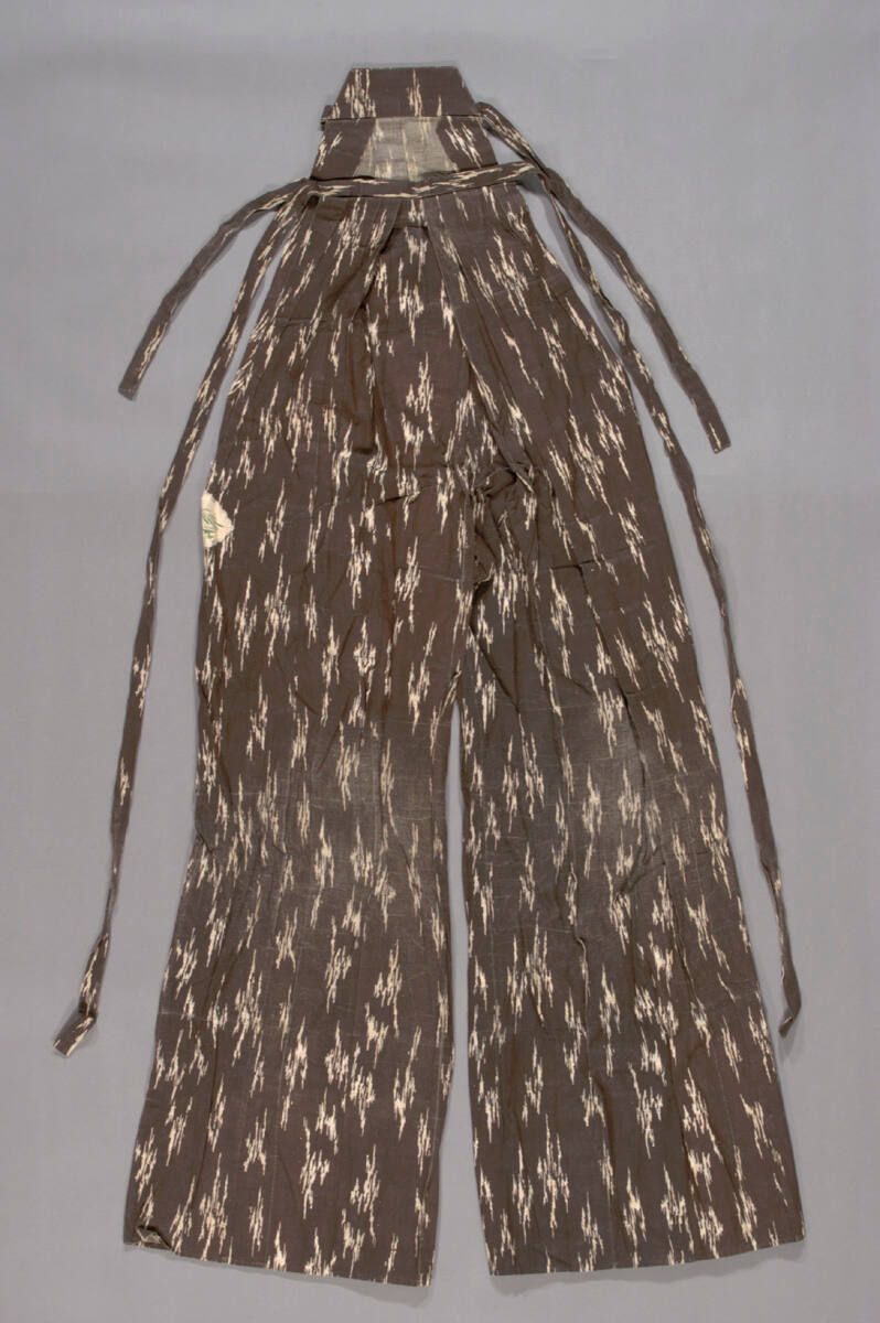 MediumBrown bast fiber (asa) with paper stencil dyeing (chugata); purple (chemical dyed) ribbons over crest on trousers and along front edges