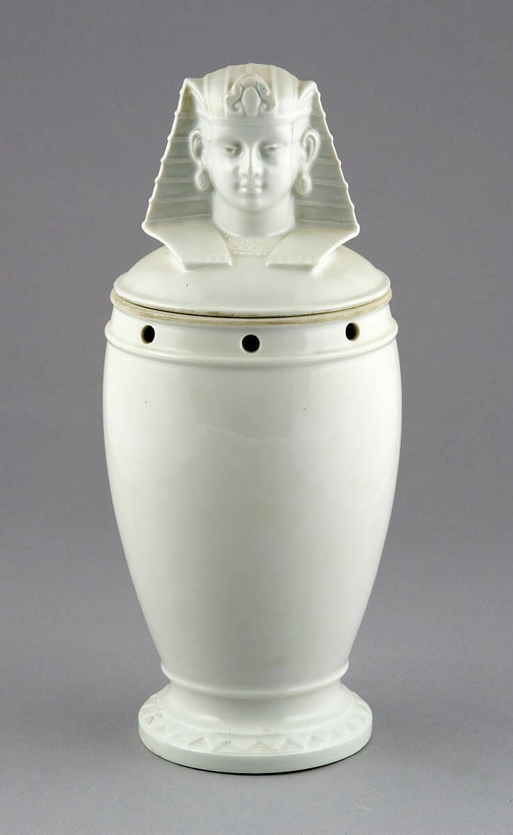DescriptionColumnar-shaped vessels with circular spreading foot; eight holes at top; circular lid with sphinx head.ProvenancePurchased by Mrs. Sibyl Ellis Renken (1894 -1962) from McMillen Interiors, New York;