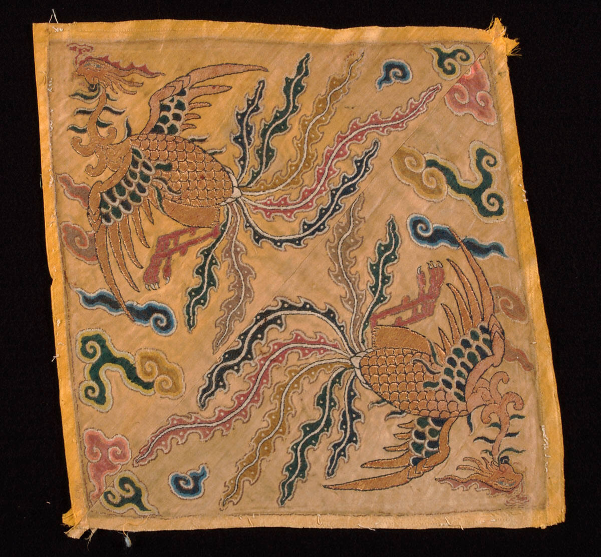 DescriptionTwo fragments from a Lama coat swen together. Yellow satin brocaded in gold and polychrome. Design of two large phoenix and clouds.