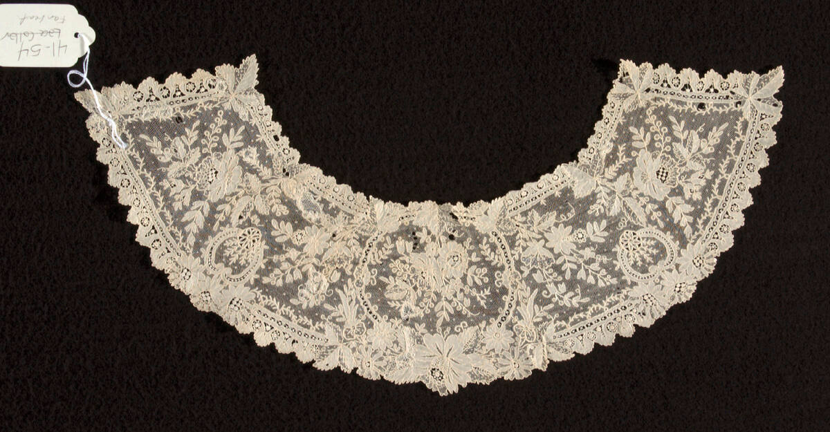 DescriptionNeedle lace of the point-de-gaze type. Solid and spaced buttonholing, fine looped mesh ground, ring decoration and simple filings, raised edges. No three-dimensional additions.