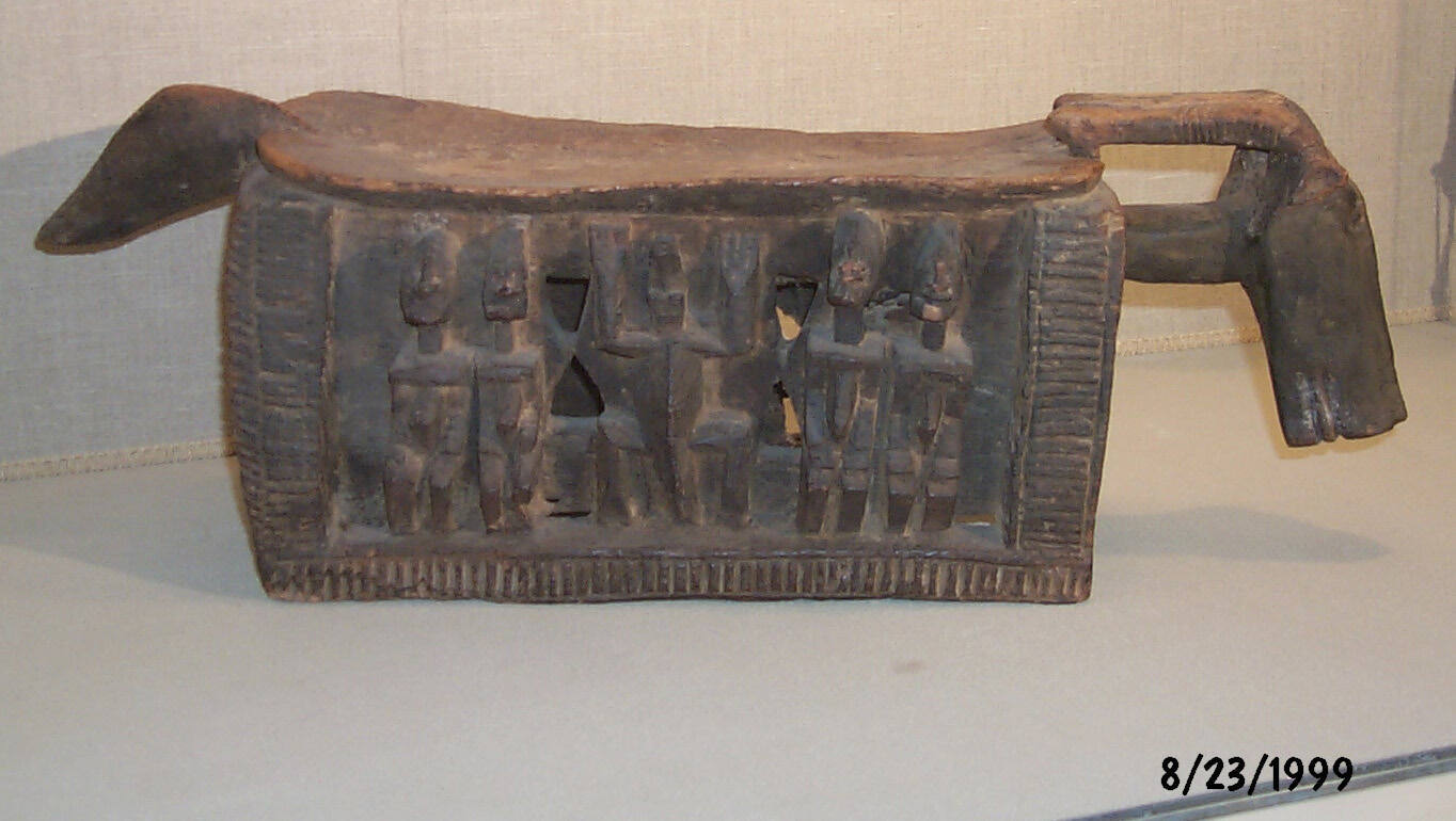 DescriptionA ceremonial stool int he form of an antelope, with the dorsal part forming an oblong planar platform. Slanted sides carved with a crocodile in the center flanked by human figures, designed in a cubistic manner. The head of the animal is stylized, with the horns sweeping backwards. A short, triangular tail.Provenance
