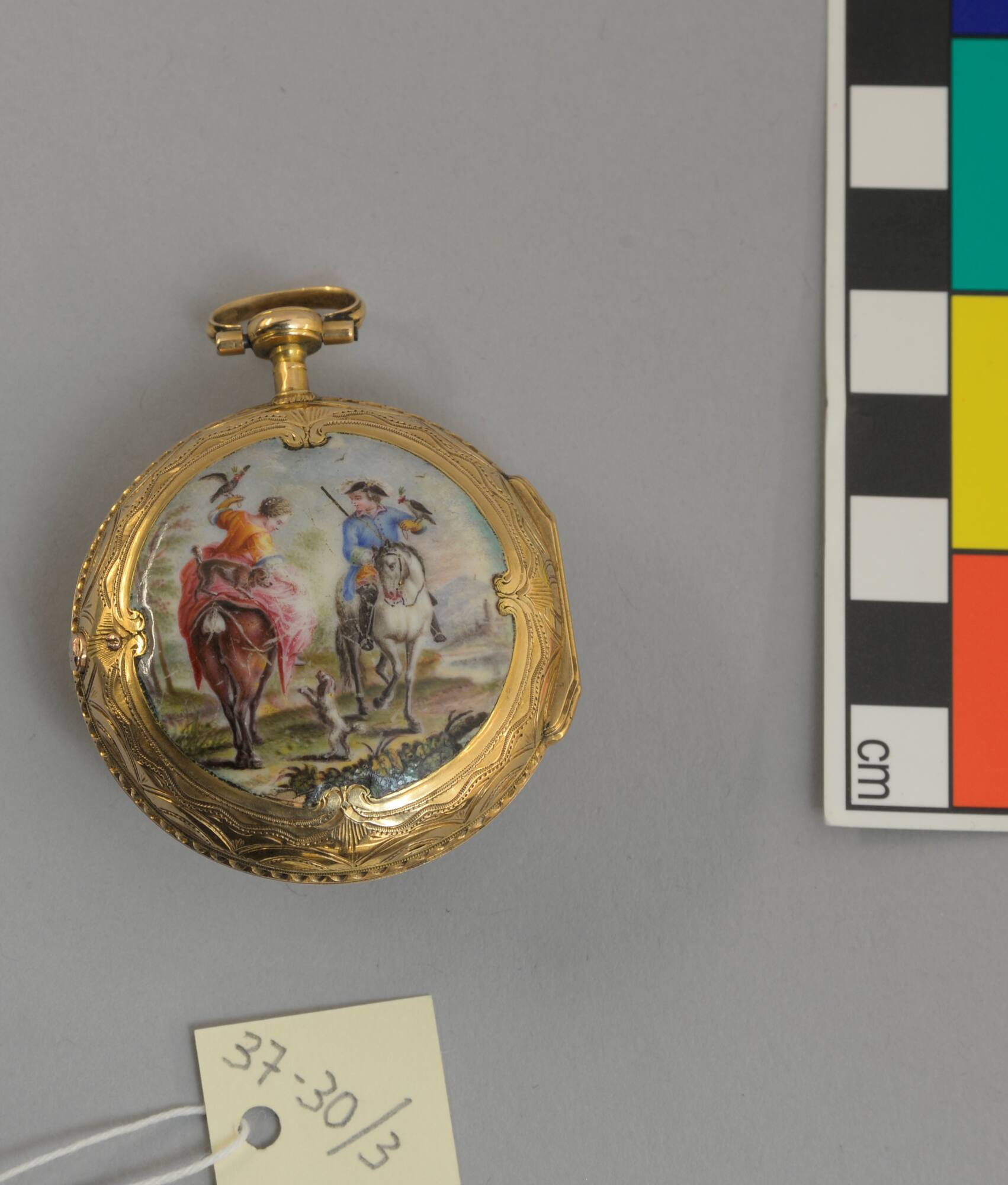 DescriptionWatch with hinged case of gold. Enamel back depicting hunting scene of man and woman on horses with falcons and dogs. White face with Roman numerals. Rounded crystal.