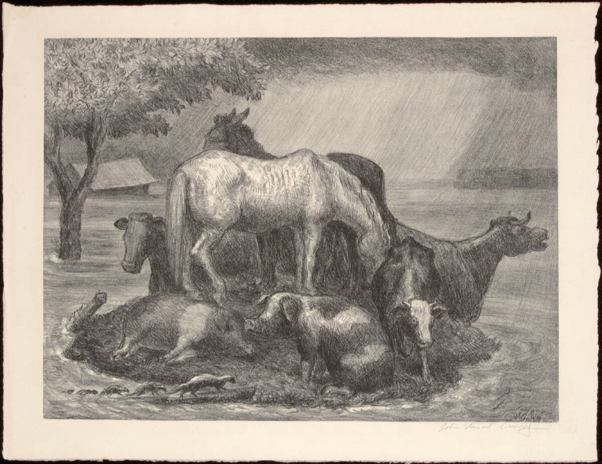 DescriptionIn the center of the image is a large grouping of animals seeking refuge from the flood. In the background to the left is a partially submerged barn.Copyright© John Steuart Curry Estate / Kiechel Fine Art