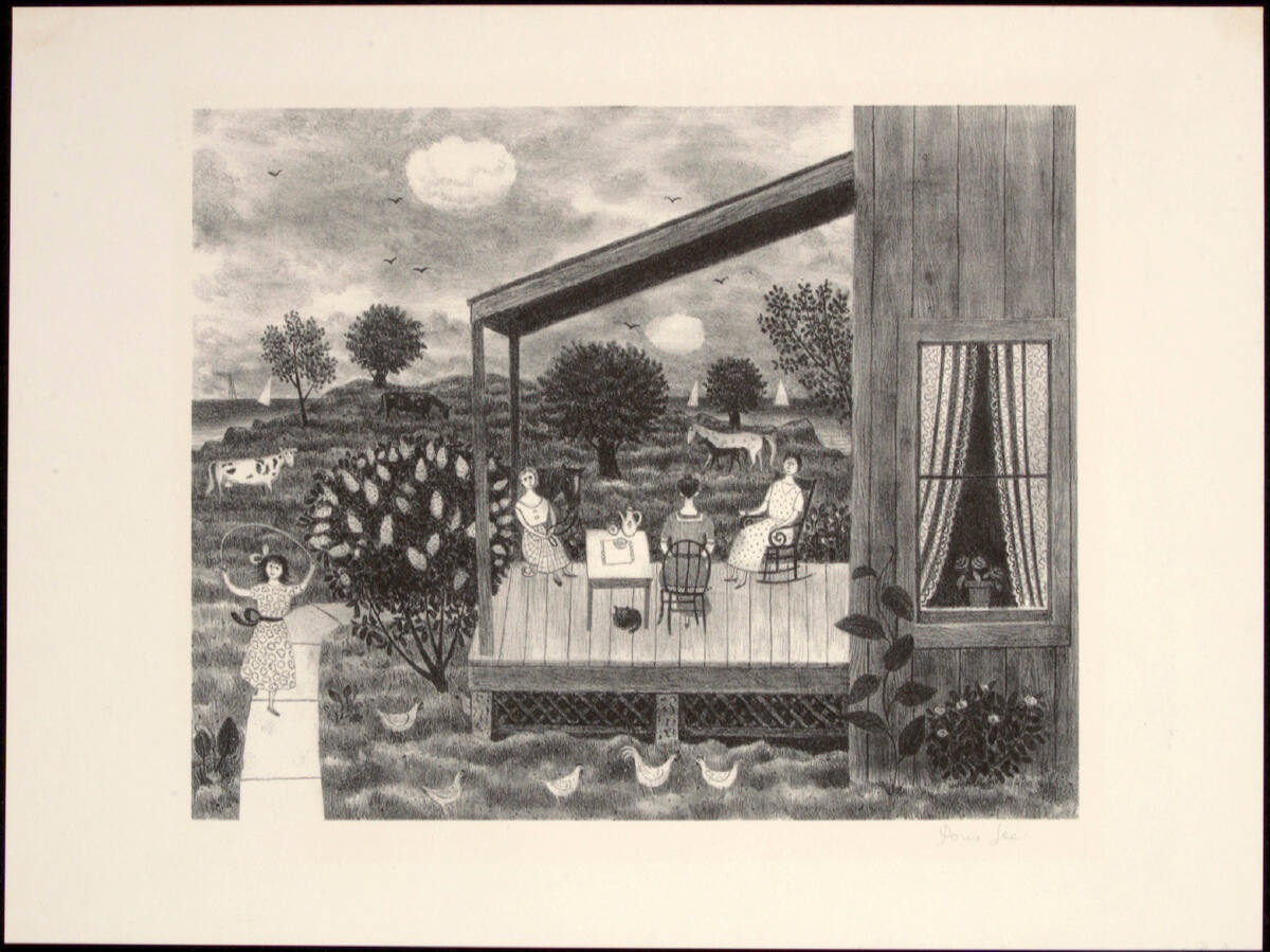 DescriptionDoll-like figures set in a country landscape. Three figures sitting on a porch, figure on left skipping rope. Various chickens, cows, and horses throughout. Puffy trees and puffy clouds. Side of house along right edge.Copyright© Estate of Doris E. Lee by William P. Emrick, Executor/Trustee