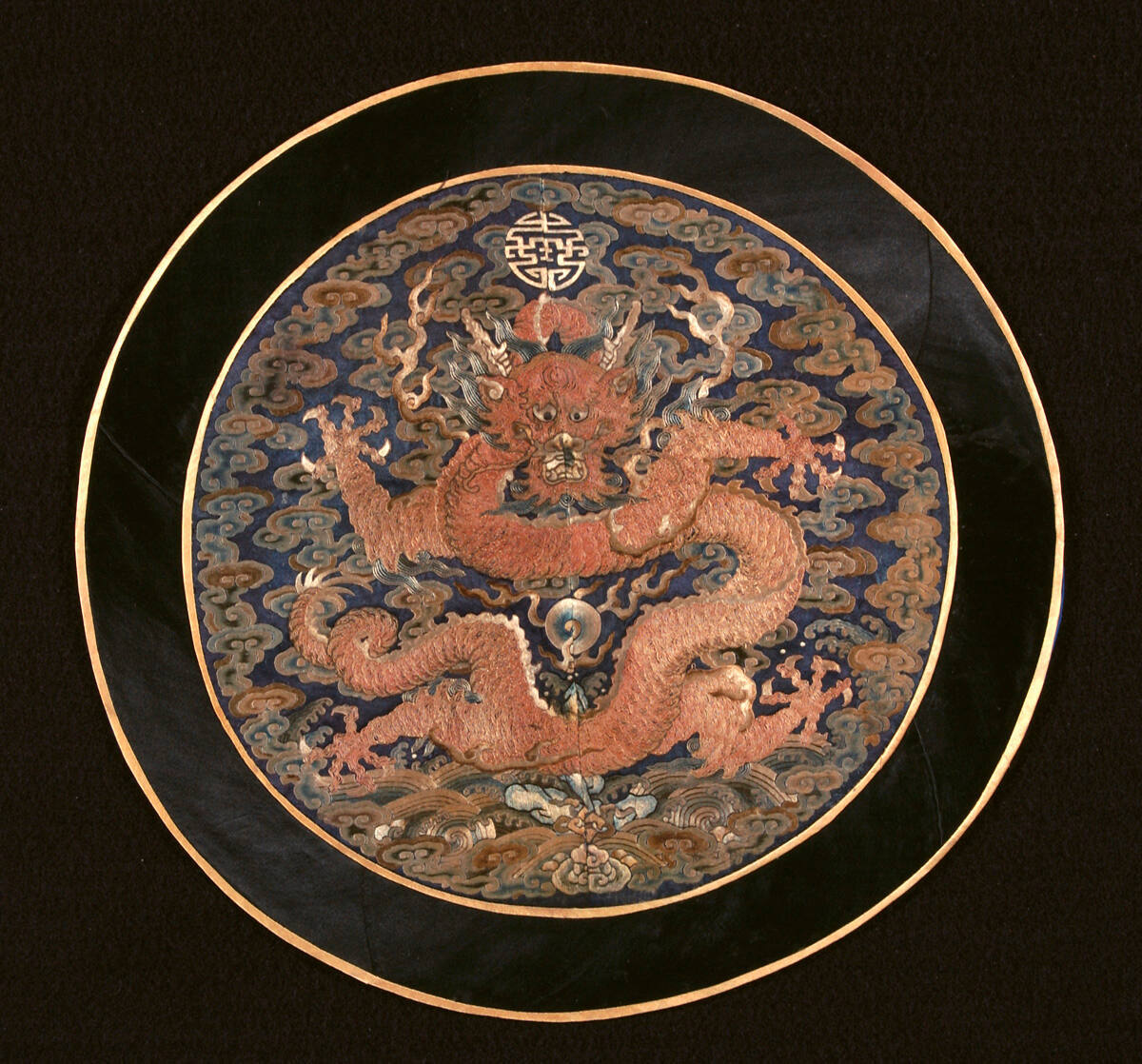 DescriptionOne of four similar medallions from a sacrificial coat. Frontal dragon embroidered in polychrome and gold thread on dark blue satin. Modern mounting.