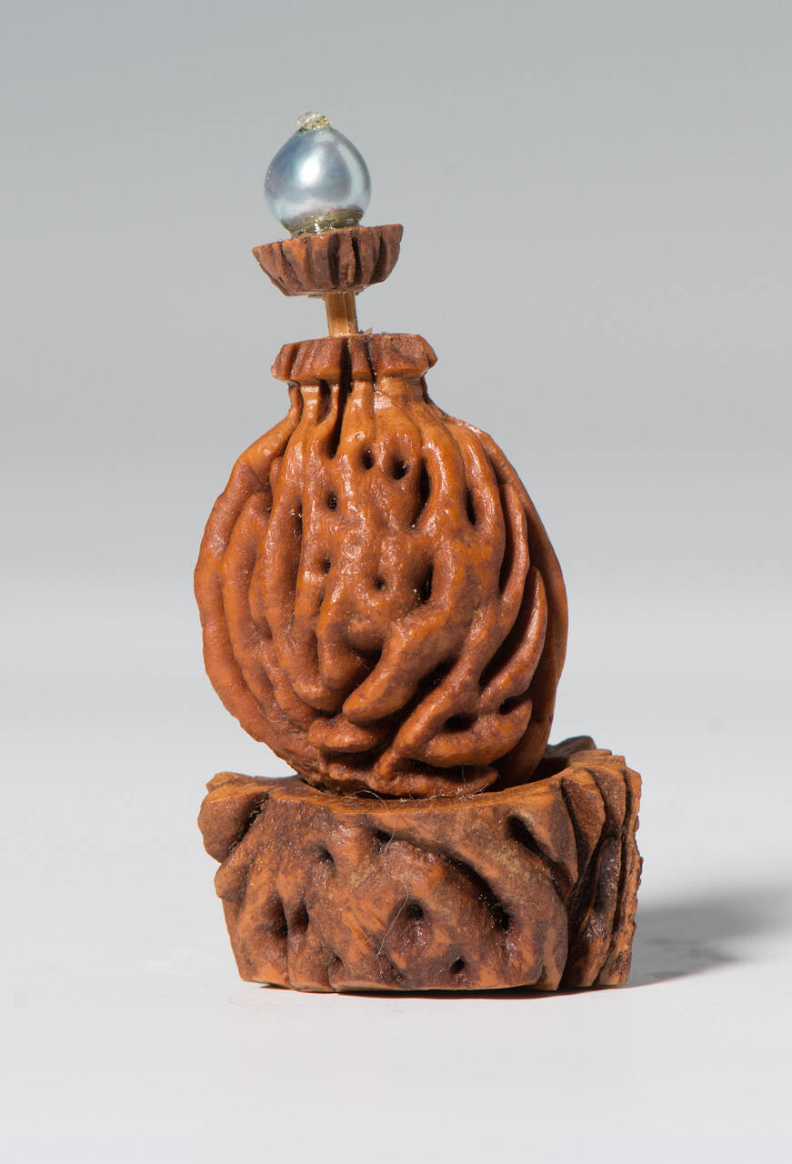 DescriptionBrown peach pit with grey pearl stopper, matching stand.