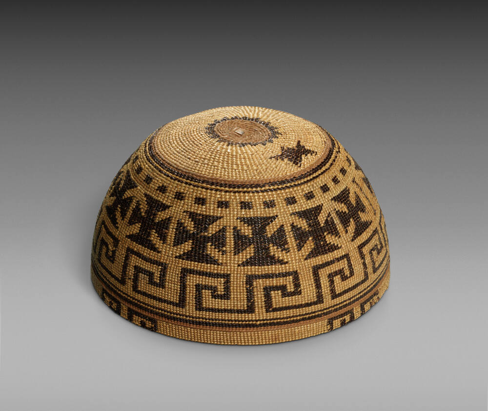 DescriptionBorder banded in brown, tan, and natural.Gallery LabelThe importance of women's basketry hats is indicated by the fact that even after the Hupa and related groups began wearing Euro-American clothes, hats remained the last surviving article of native dress. Worn during ceremonial events, these beautiful objects reflected the owner's status and taste. The progression of dissimilar yet harmonious geometric motifs encircling this hat establishes a visual reversal of figure and background. Tribal aesthetics dictated that harmony be established between the large, dominant pattern on the side of the hat and the smaller motif at the rim.