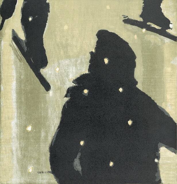 DescriptionForeground, center, half-length hatted figure in black facing left. Top left corner, two black feet, one of them with partial leg, both wearing skates pointing down. Top right corner, black foot with skate pointing right. Grayish-yellow background of striated wood grain. Random white dots suggest snow. Shadows from skate blades in darker gray.Gallery LabelChristopher Brown produces images from personal recollections and from photographs he has taken, creating large-scale paintings and prints featuring irrational, dream-like landscapes where scale and distance produce surreal juxtapositions. In this work, we see severely cropped views of three skaters captured at an angle from above. The silhouette of a man moves into our frame of vision as the skates of two people in front of us move out and into the picture plane. These extreme angles give the viewer a dizzying sense of speed. The reduced palette of dark tones and watery grays with flecks of falling snow heightens the sense of isolation and cold.