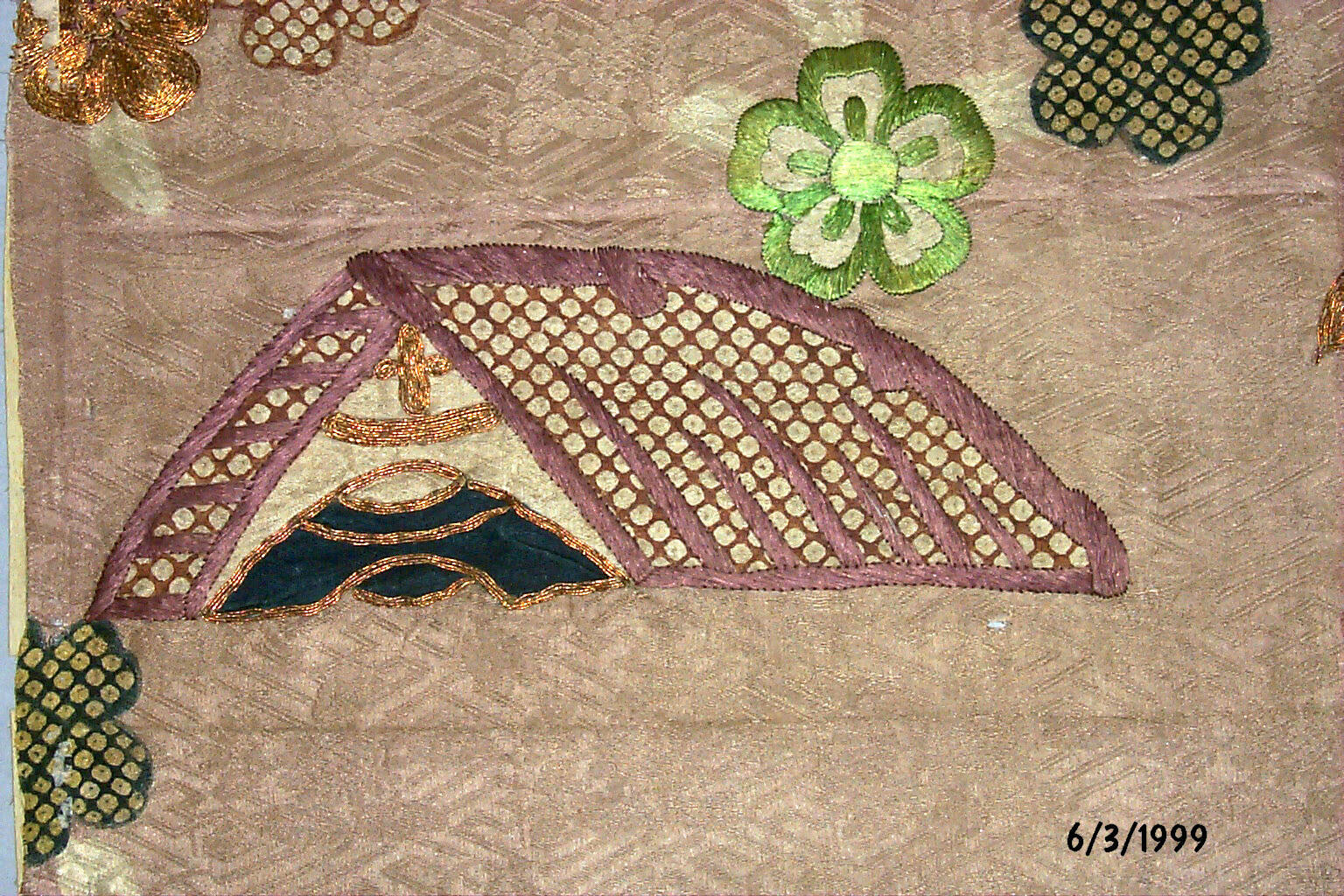 DescriptionGold-figured satin ground with stencil tie dyeing, and silk and metallic thread embroidery. Design of cherry blossoms and rooftops.