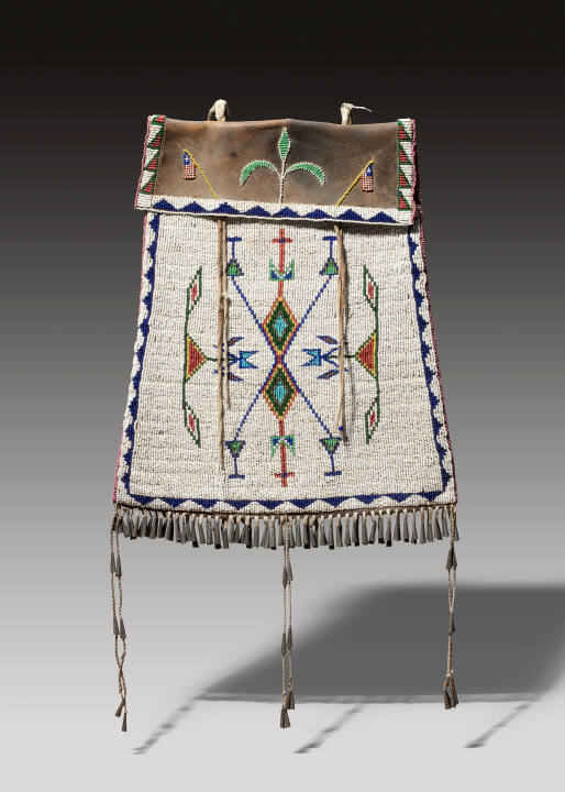 Gallery LabelBeaded dispatch cases, similar to strike-a-light bags but larger, were made by Plains peoples during the early reservation era. Constructed from stiff, commercial saddle or boot leather, they were ideal for transporting paper documents, which accounts for their name. Some were undoubtedly used for this purpose, but anthropologists who were collecting objects during the final decades of the 19th century describe them as containers for combs, paint-bags, mirrors and other toiletries. This example is notable for the elegance of its finely beaded design and delicate integration of diverse materials.