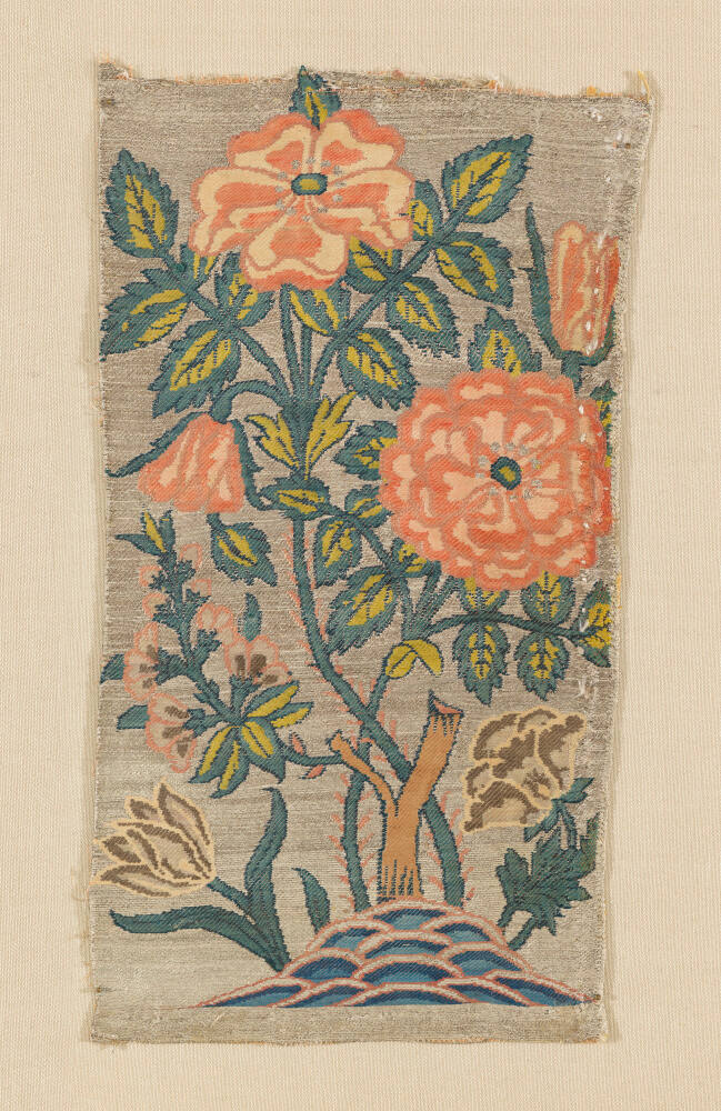 DescriptionSilver ground, rows of flower shrub, tulips, pinks, roses in blue, green and pink.Gallery LabelIn the 17th century, contact between Europe, the Middle East and Eastern Asia disseminated ideas, colors, patterns and textiles. Although floral patterns were widely made elsewhere, no other workshops could emulate Persian weaving. The Persian aristocracy boldly displayed their status and wealth on the walls, floors and furniture of their magnificent palaces. Some of the most luxurious woven accoutrements were designed with a silver foil-wrapped silk ground with exquisitely rendered floral motifs in bright colors, as seen in these examples.