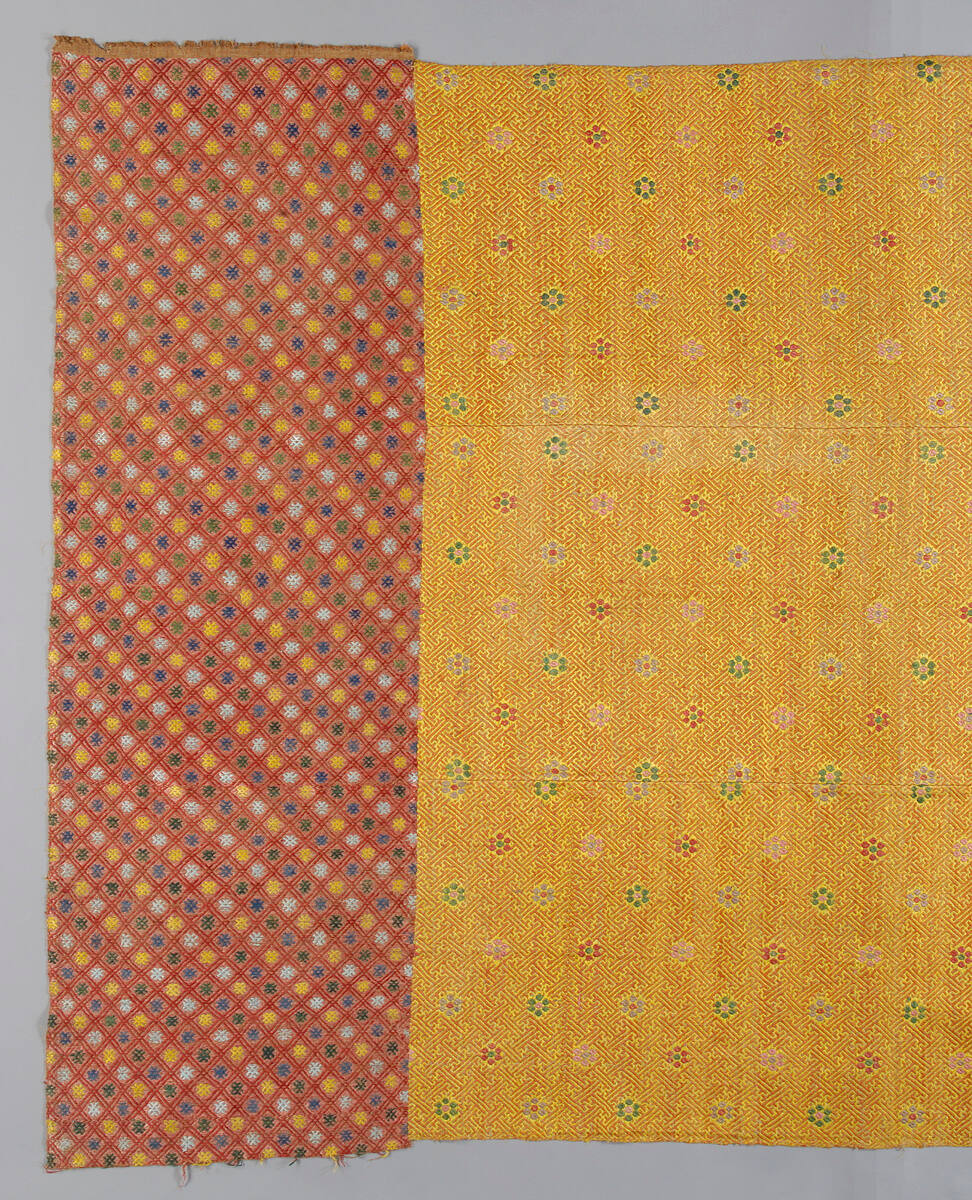 DescriptionFormosa needlework bed cover, yellow with geometrical design and small flowers.